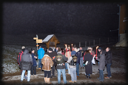 Treffpunkt war die Talstation der Luftseilbahn Dallenwil-Wirzweli. Da alle super pünktlich waren, konnten wir sogar eine Gondelfahrt früher nehmen. Oben angekommen wurden die Fackelträger bestimmt, damit wir den Weg etwas kuscheliger gestalten konnten.